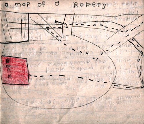 | Early work: proto-conceptualism from 3rd July 1964. Note how the piece evokes the utility of drawing whilst remaining resistant to any actual concrete reading. This is particularly demonstrated by following the dotted line and attempting to interpret consistently what is indicated in its relationship to the other lines it crosses. This failed, the rest of the diagram falls apart and we are left merely (merely?) with a poetic evocation of the "robery". | |