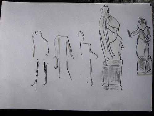 | Madrid 2011. Emboldened, I took a sketch book for a long weekend. Looking and drawing out in the world. Some things stayed nicely still for me; others moved and in those cases I tried to stay calm and get what I could.