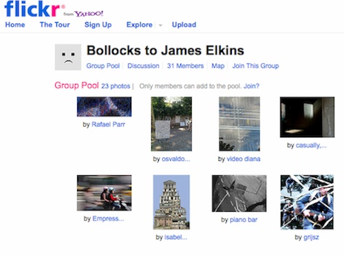 I was just getting into my stride on Flickr when I read some comments by James Elkins that incensed me so much I started a group there called "Bollocks to James Elkins", prefaced by an short polemical essay. You can click on the image across to read it. Briefly, Elkins, a thinker and writer I'd previous rather enjoyed and respected had managed to combine common or garden snobbery with the worst of the art world's fear of taint by the non-initiated and, most heinous of all in a thinker about art, a horribly blind, ignorant and ahistorical bureaucratic formalism about what art can and cannot be.